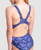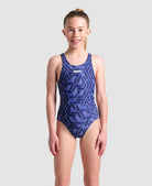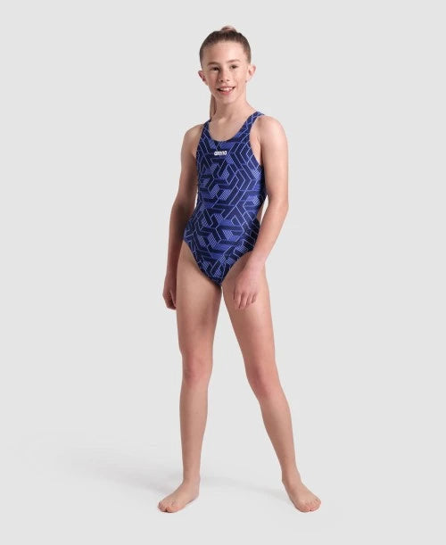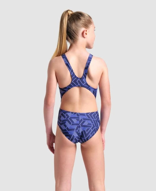 Watch her outshine the competition in Arena's Escher-inspired Escape Swimsuit for girls!