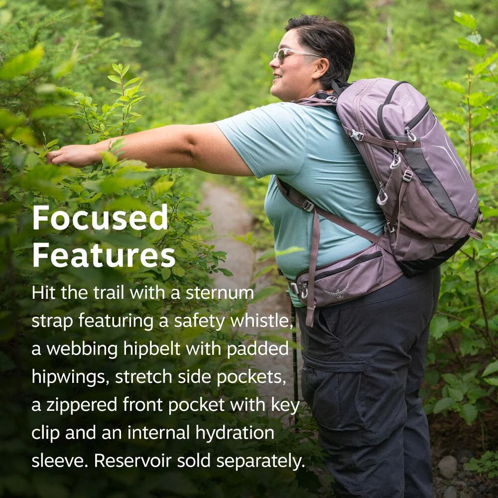 Featuring a sternum strap with safety whistle, a padded hipbelt with two quick-access pockets, a front shove-it pocket and an internal hydration sleeve. (Reservoir sold separately.)