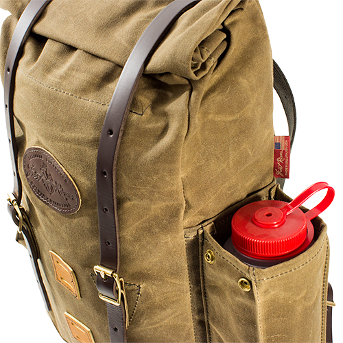 The long, harness leather straps and extended top allow expanded capacity. Waxed canvas is water resistant, and when matched with a rolled top it is especially weather tight. There’s a loop for a blinking bike light, along with lash squares to tie stuff on… it’s a waxed canvas commuter pack that’s made in Duluth and really hauls! With 2-in-1 pockets on the outside, (think water bottle pockets) and internal sleeves (think laptop or hydration bladder).