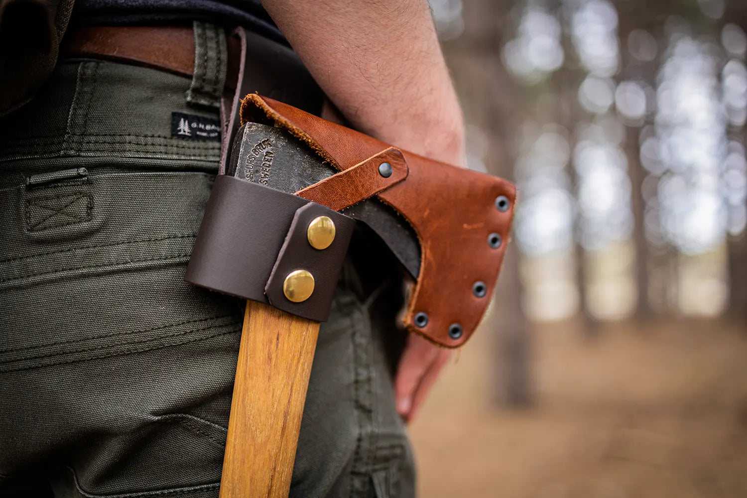 FR's Bridle Leather comes from S.B. Foot Tannery in Minnesota. They are the same tannery that provides Red Wing Shoes with their leather. (You know it's the good stuff!) The leather on this loop will only look better with age as it wears in. The durable brass snaps will reliably hold your axe in place. The loop is designed to accommodate even the larger of belts, up to 2in in width. This Axe Loop is crafted by the skilled tradespeople of Frost River and guaranteed for life.