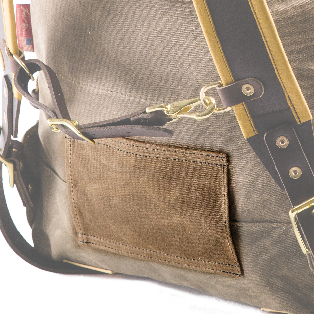 18 oz. waxed canvas, premium leather, solid brass hardware. |