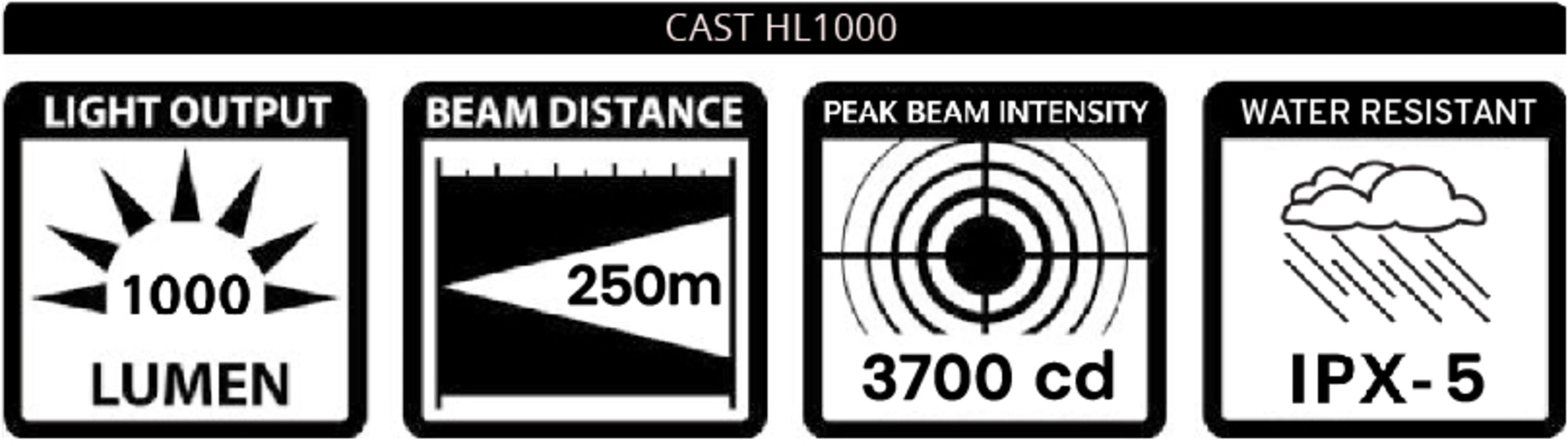 | Mode/Lumen/Run Time | High/ 1000lm/ 1.5 hrs, Middle/ 500lm/ 3.5 hrs, Low/ 250lm/ 6 hrs, Night flash/ 50~10lm/ <48 hrs, Day flash/ 100~200lm/ <24 hrs |