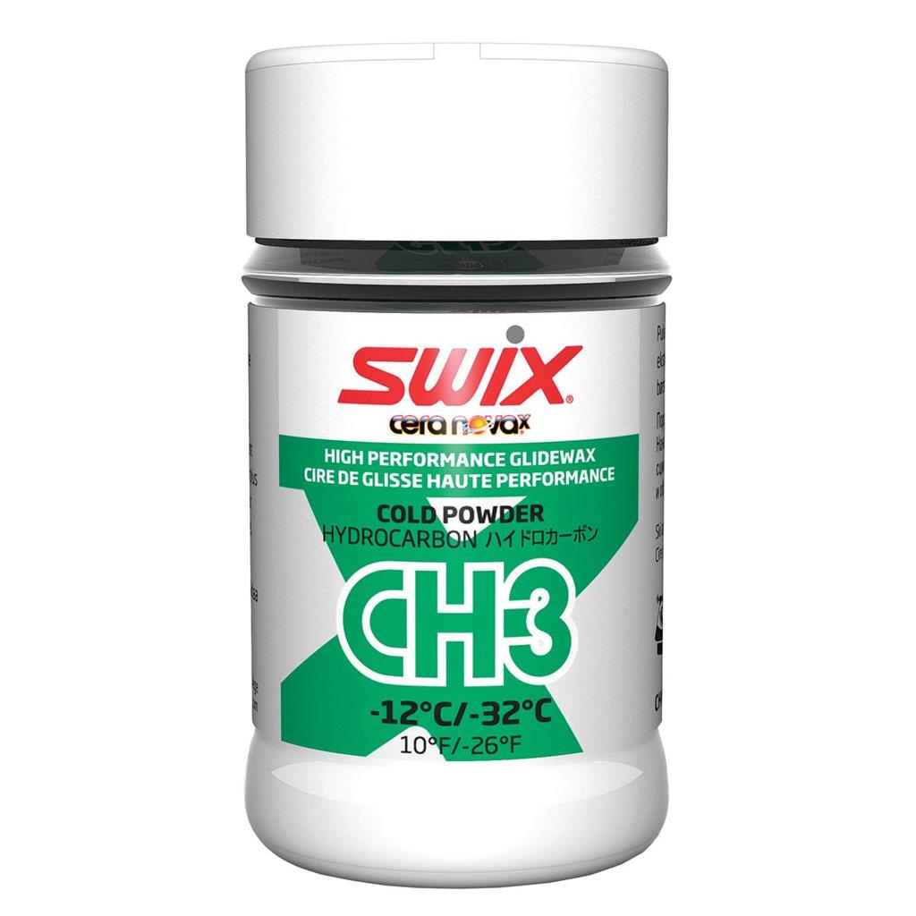 In conditions when the base is subject to extensive wear from e.g. new artificial snow, the relevant wax for the conditions is applied and ironed in first. Apply the CH03X to the base when the wax is still liquid/hot. Then iron the CH03X powder into the wax layer. Allow to cool then scrape off and brush away any excess wax.