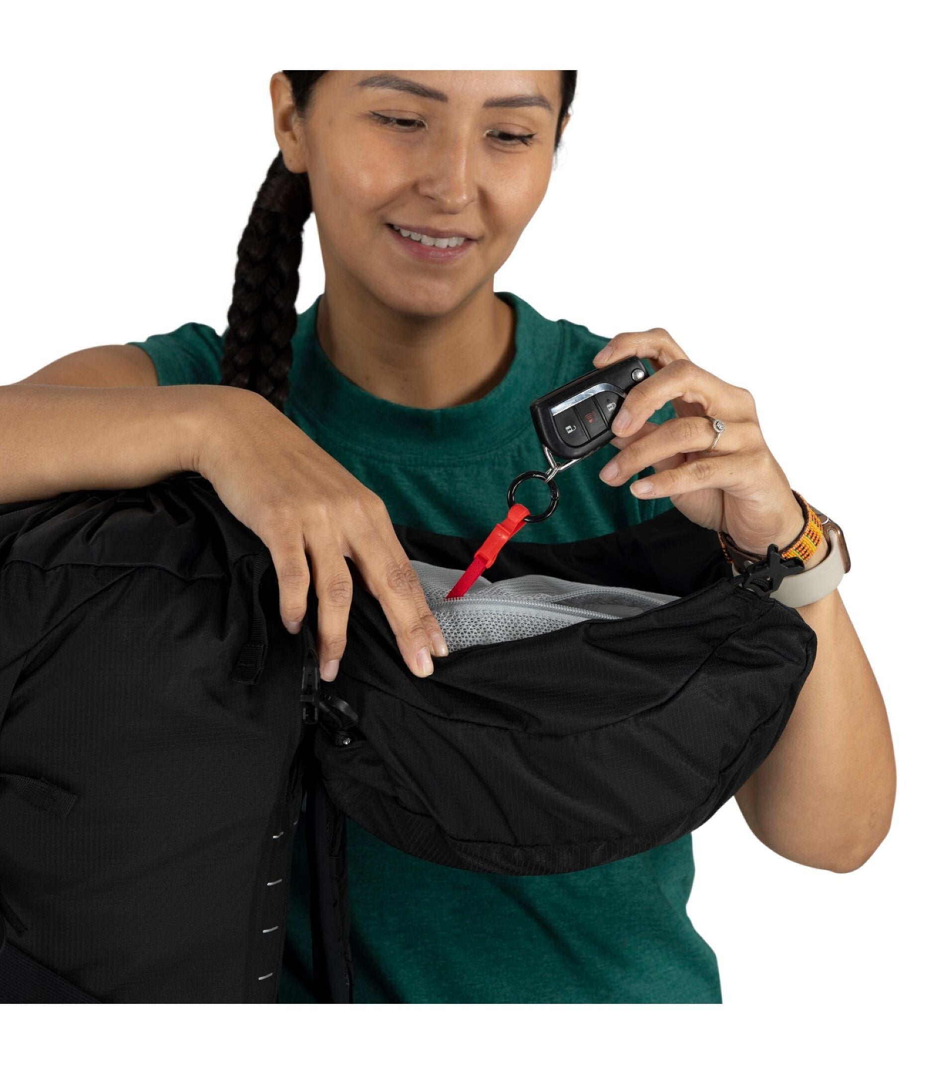 - Under lid zippered mesh pocket with key clip
