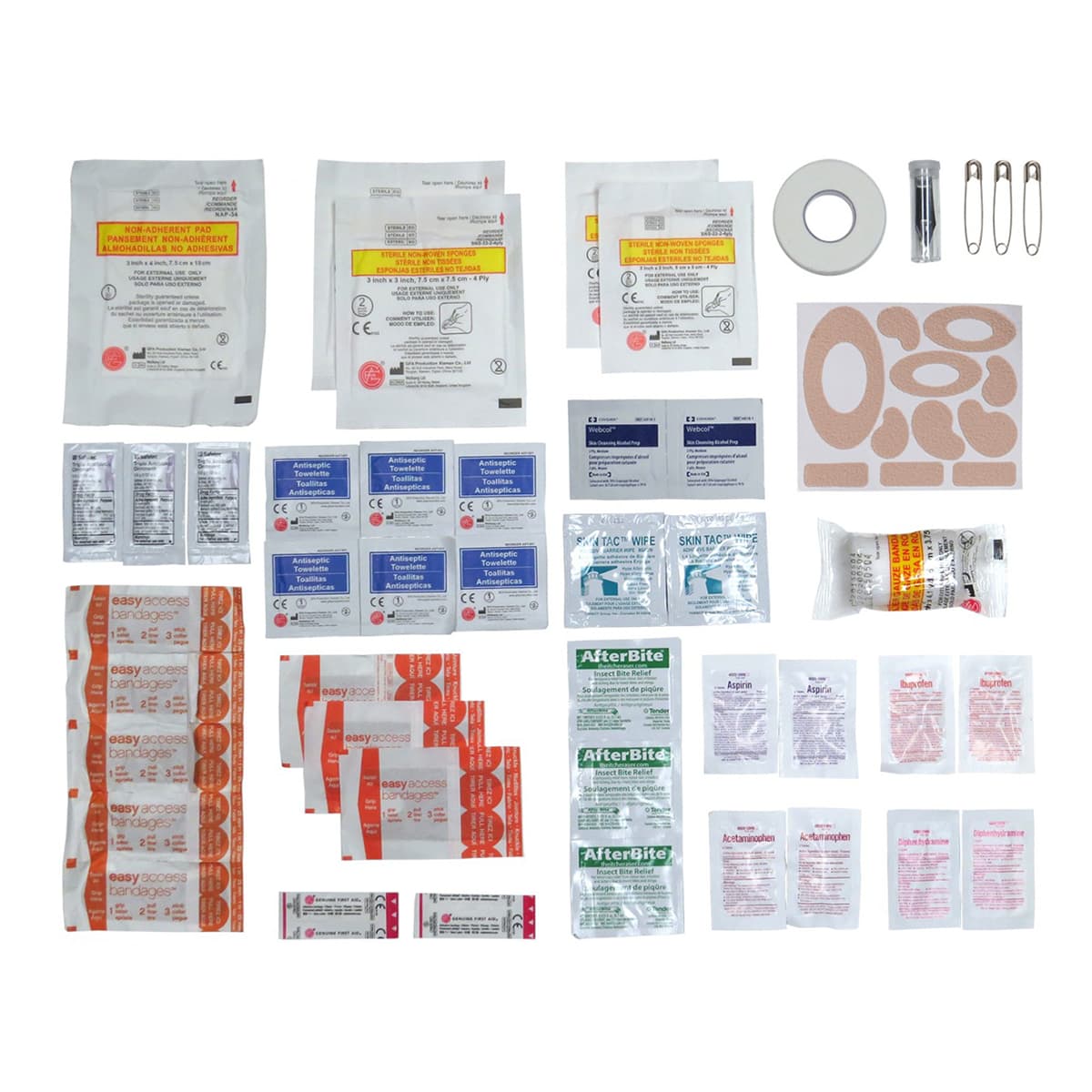 - Treatment for Wounds and Illnesses – Clean and close wounds with antiseptic wipes, butterfly bandages, sterile dressings, and a topical adhesive. Manage pain and illnesses with a wide array of medications.