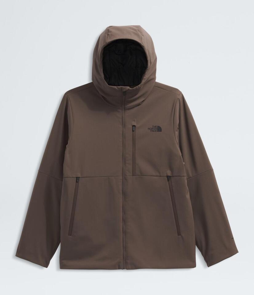 Windproof, water-repellent soft-shell hooded jacket for insulated, breathable warmth during active winter endeavors.