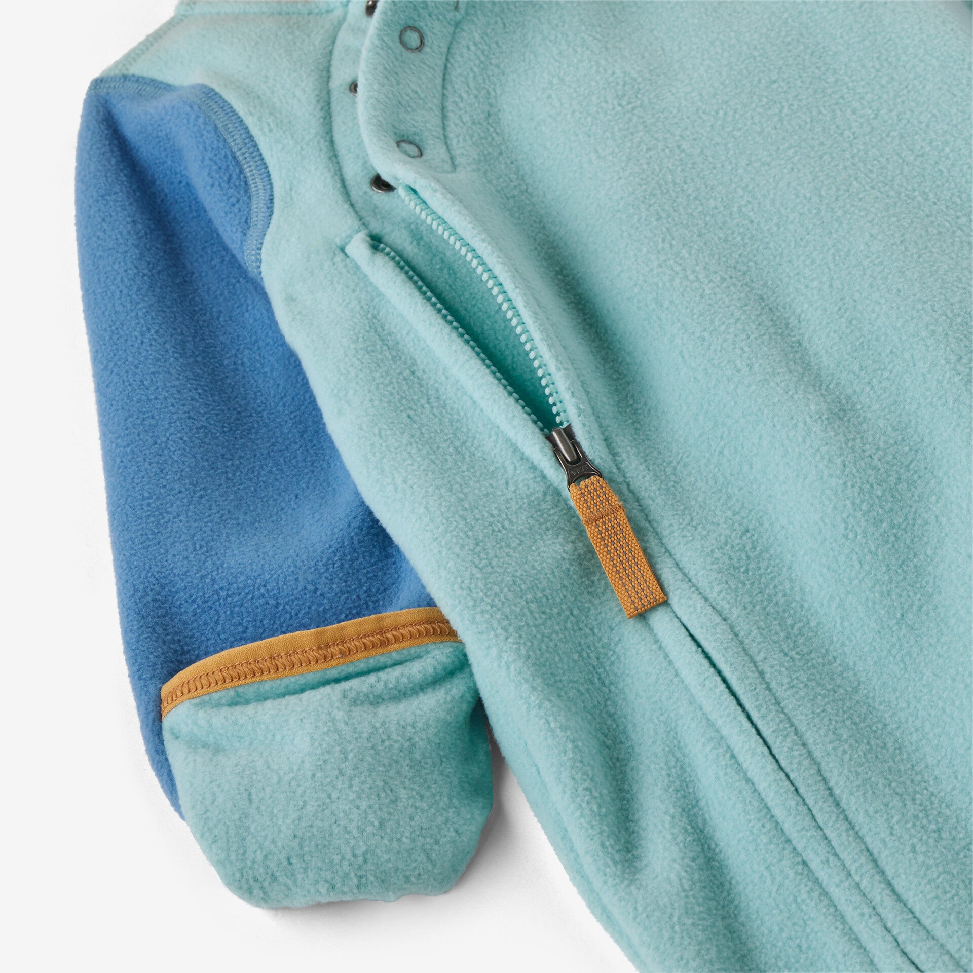 Three-snap closure at neck opening keeps zipper away from neck and face for comfort