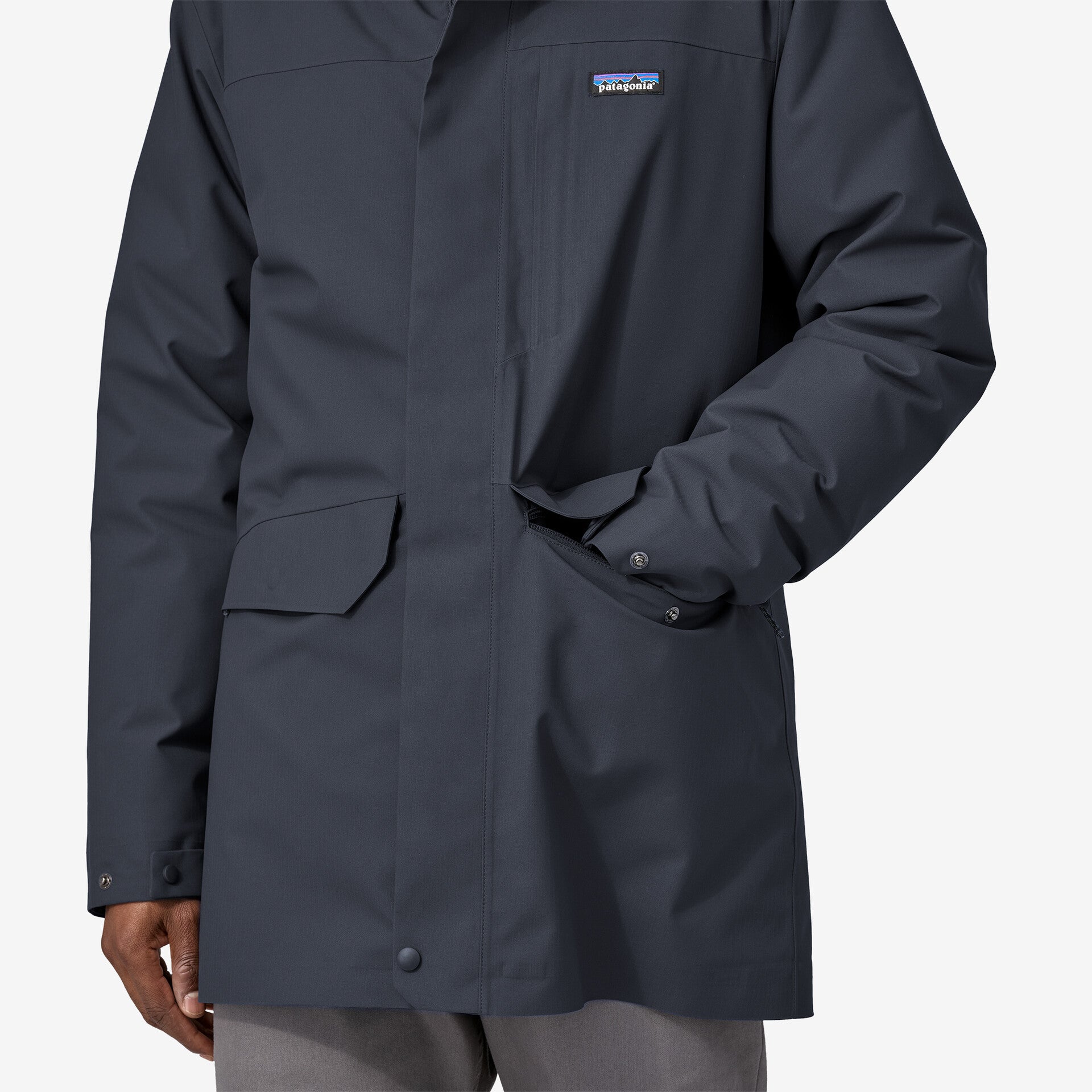 The hem of the zip-out jacket adjusts with hidden cords that are routed inside the front pockets