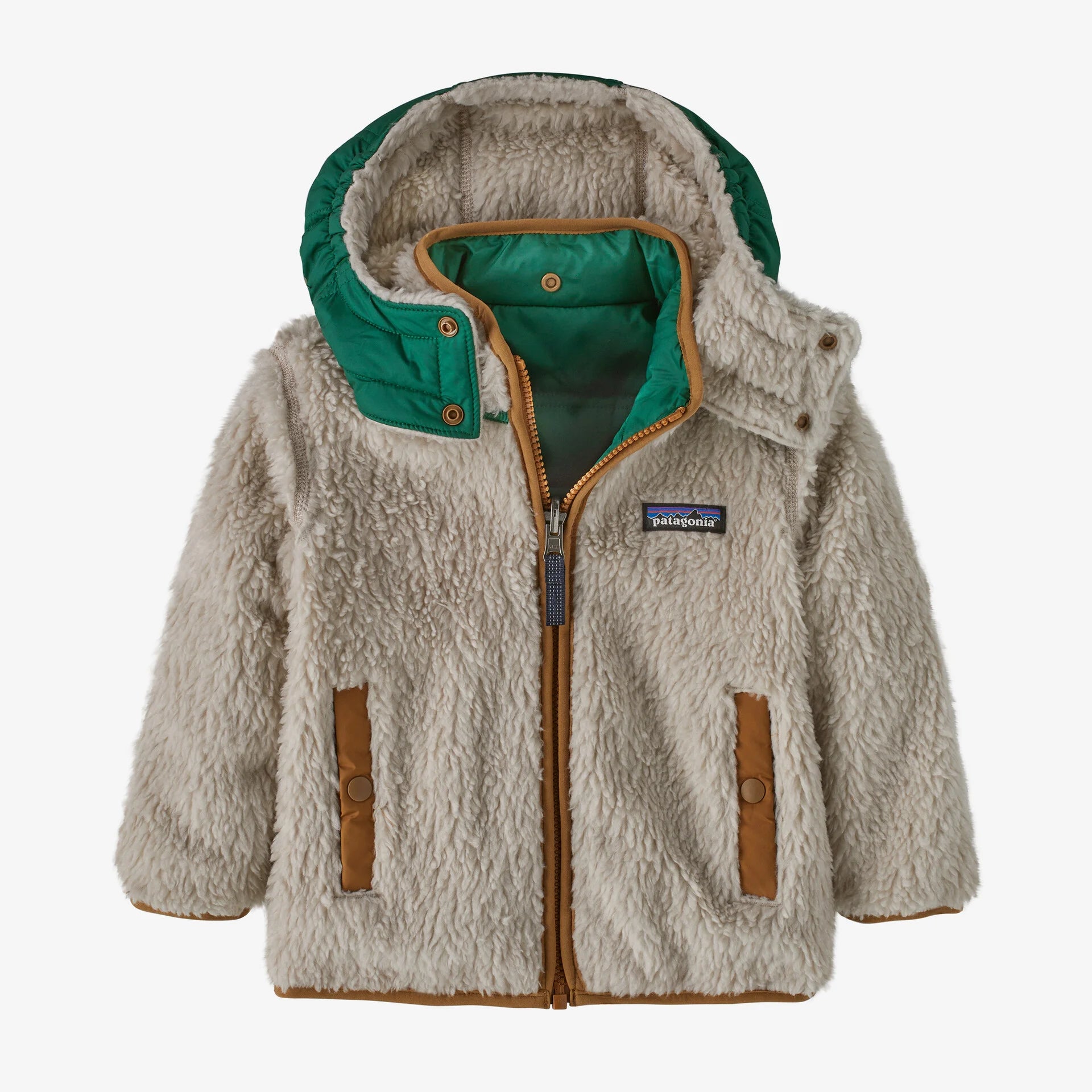 Snap-off hood attaches to both sides of the reversible jacket and has a snap-front closure; elastic binding along the hood opening provides a stay-put fit