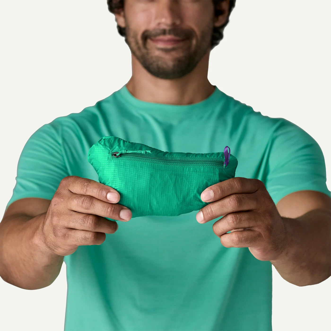Zippered chest pocket converts to a stuffsack with a reinforced carabiner clip-in loop