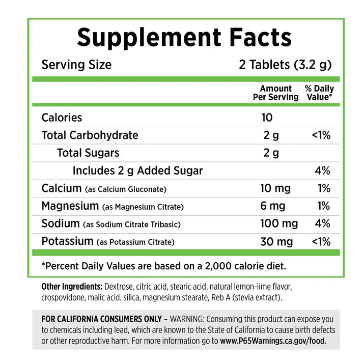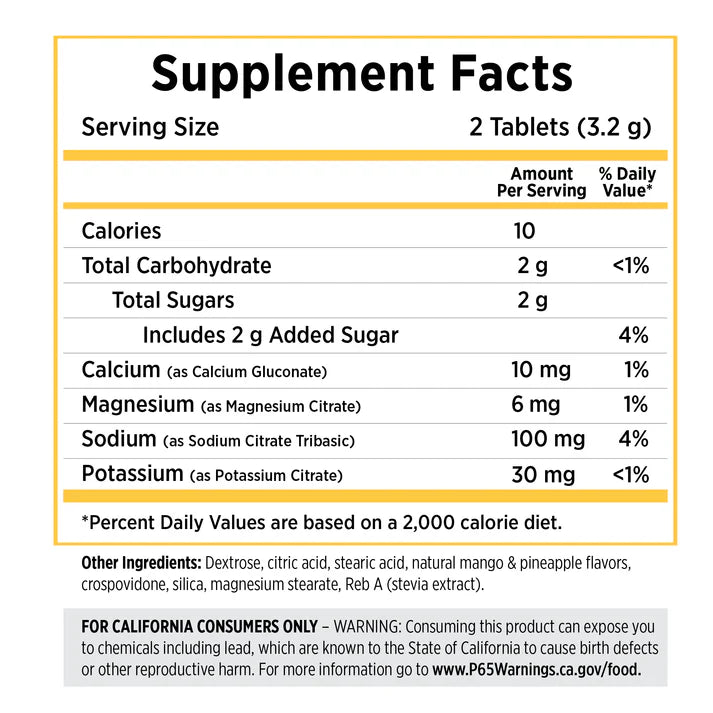 - Each serving (2 tablets) contains: 100 mg sodium, 30 mg potassium, 10 mg calcium, 6 mg magnesium.