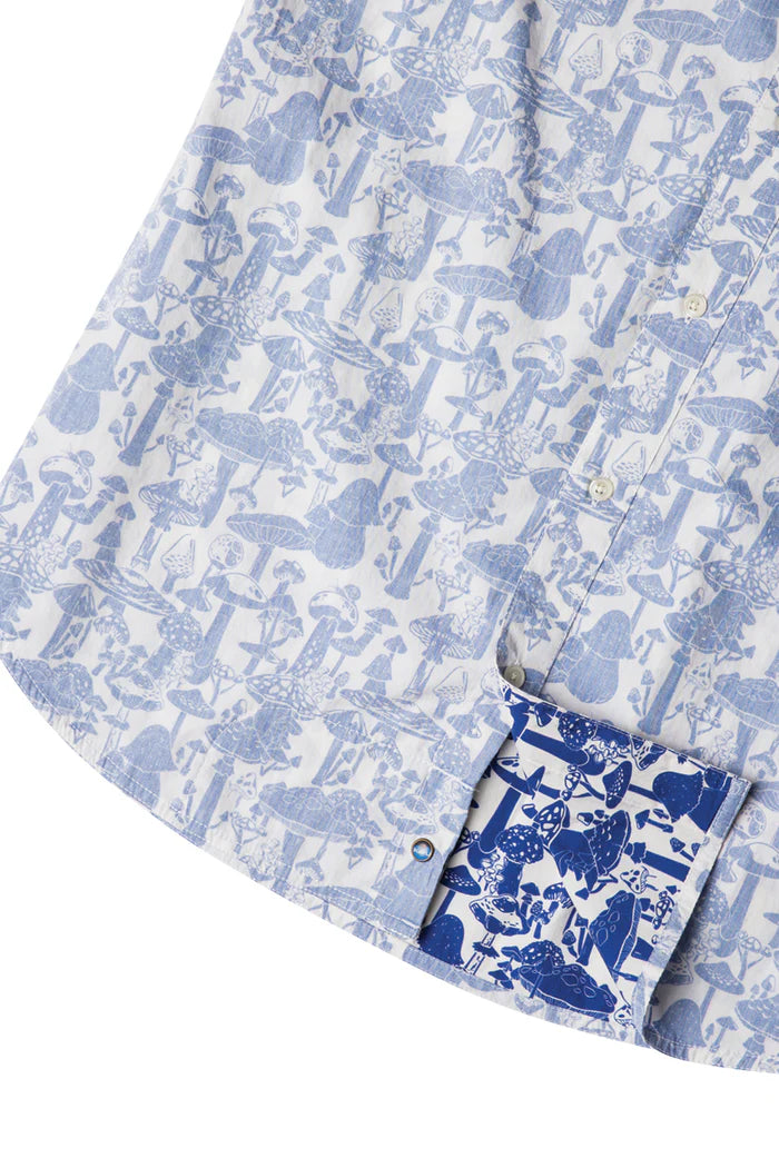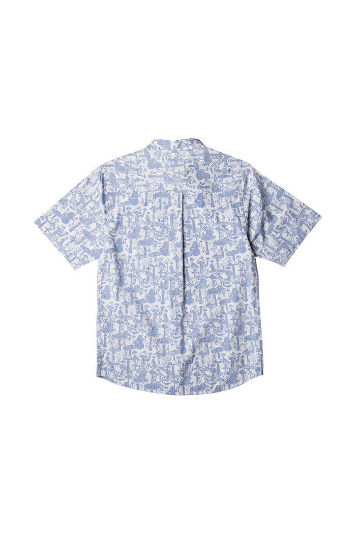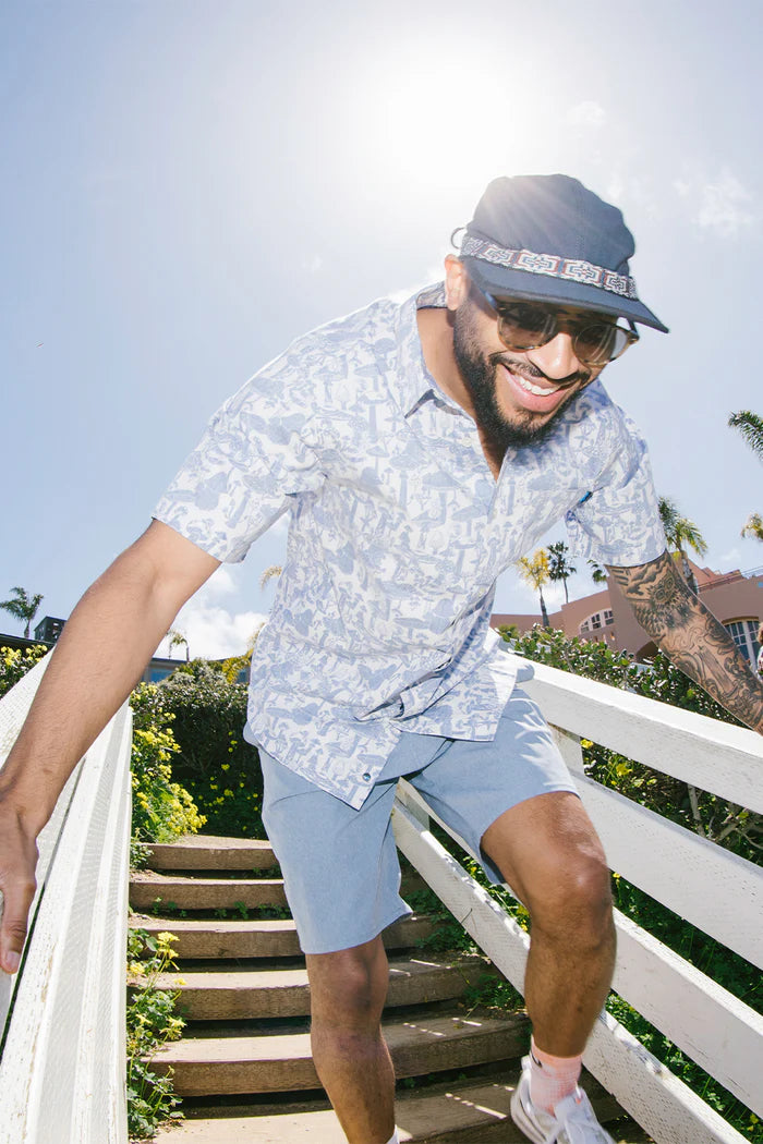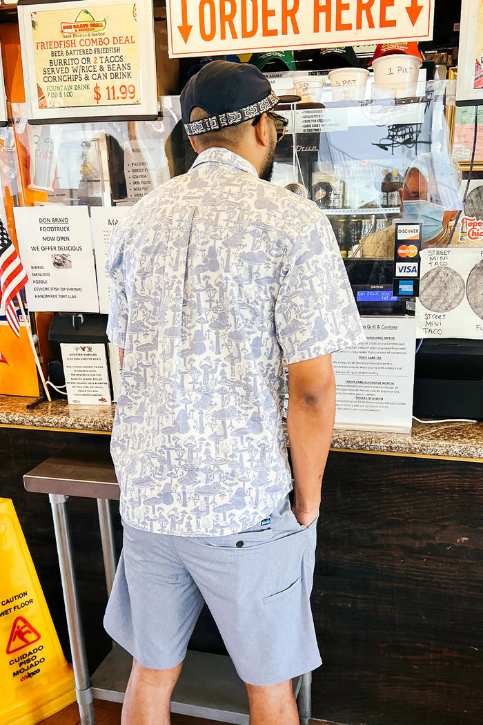 Reverse printing is just so summer with its washed down feel, sun-faded look, and laid back style. Single chest pocket and 25% certified recycled polyester dyed to match buttons.