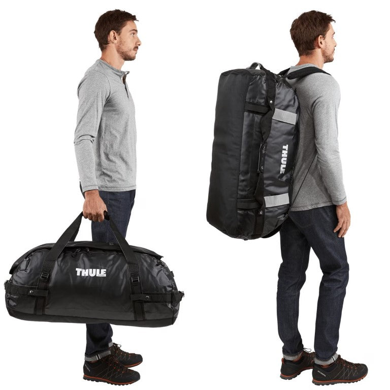 Thule Chasm 90L duffel bag is rugged, weather-resistant, and can be converted into a backpack with shoulder straps that tuck away when not in use.