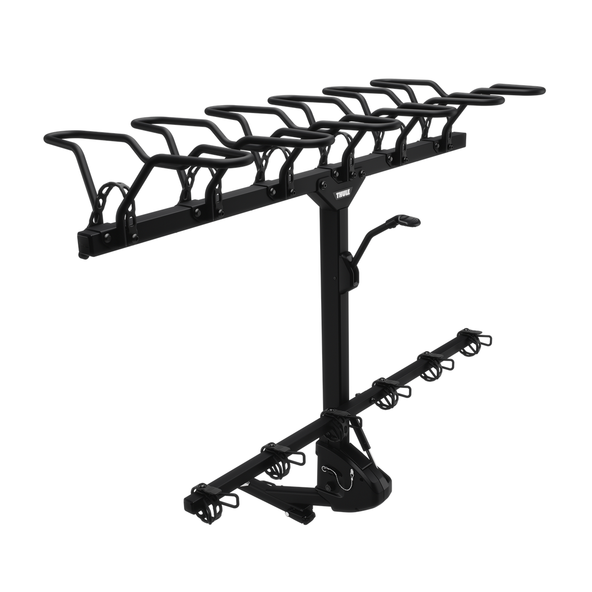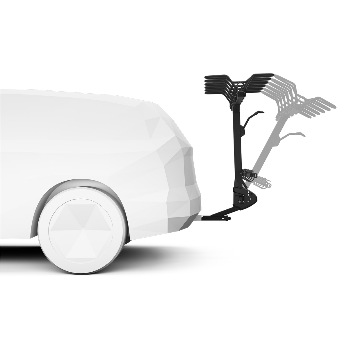 The dual TiltAssist damper makes handling practically effortless. Simply push down the tilt release lever and tilt the rack down, roll up the bikes, give the tilt release lever a second pushdown, and raise the rack back up. The damper makes it a breeze as it gives you weight assistance in both directions with bikes loaded.