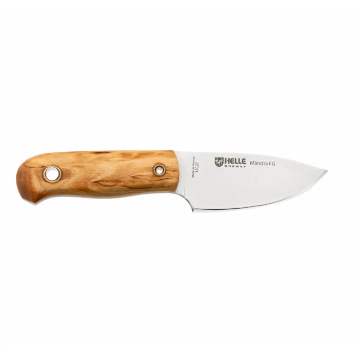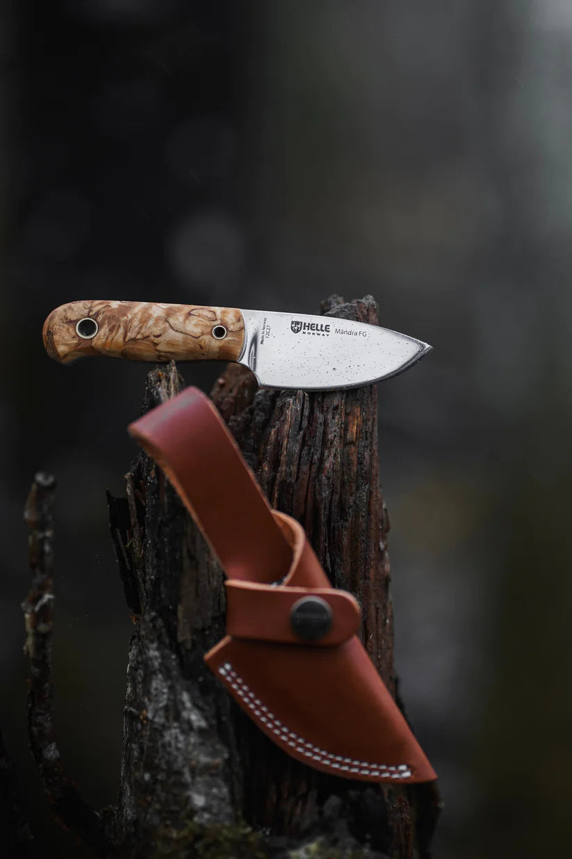 When Helle decided to make a full flat grind knife, the Mandra was the obvious choice. It is small, well-proportioned and has a blade shape that invites slicing. It fits in your pocket, on your belt or around your neck, and is ready and available whenever you need to harvest, cut, slice, dice or cook - the new Mandra FG is the ultimate allround blade for the hiker that enjoys the food breaks as much as the hike itself.