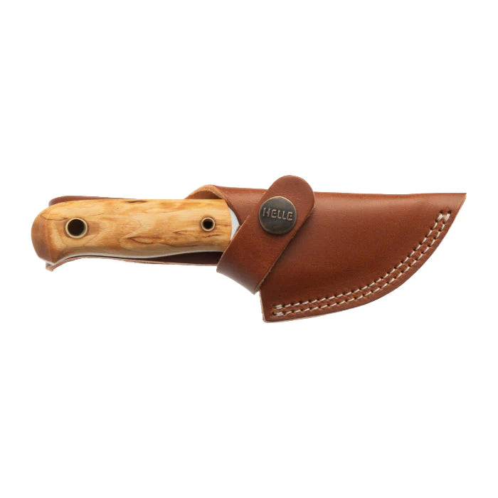 The Mandra FG comes with a tan leather sheath with a snap button for secure attachment. The white stitching matches the colour of the liner of the knife.