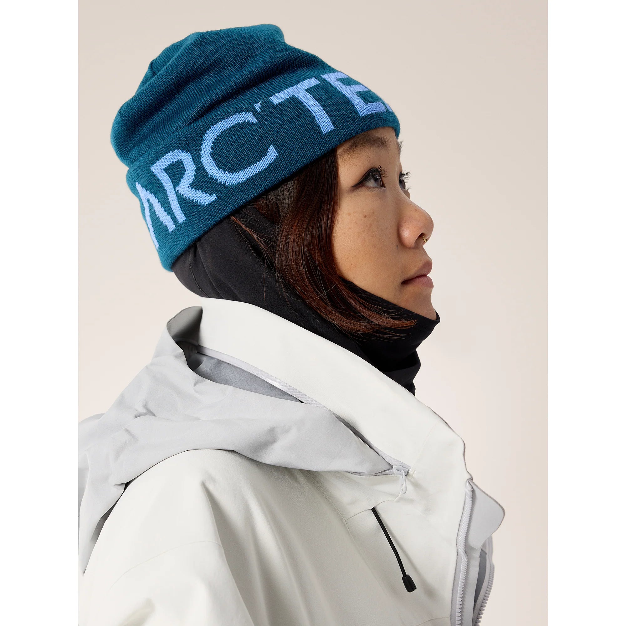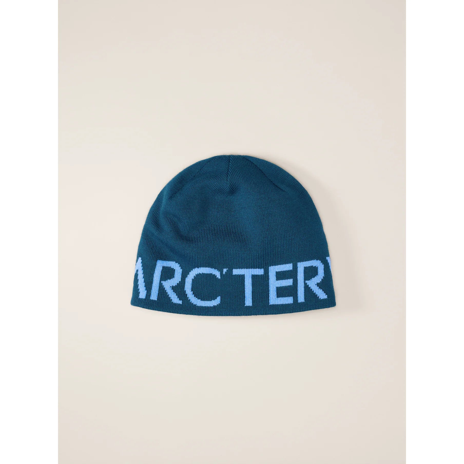 Close fitting wool blend reversible toque with a bold Arc'teryx word logo on one side, solid color on the other.