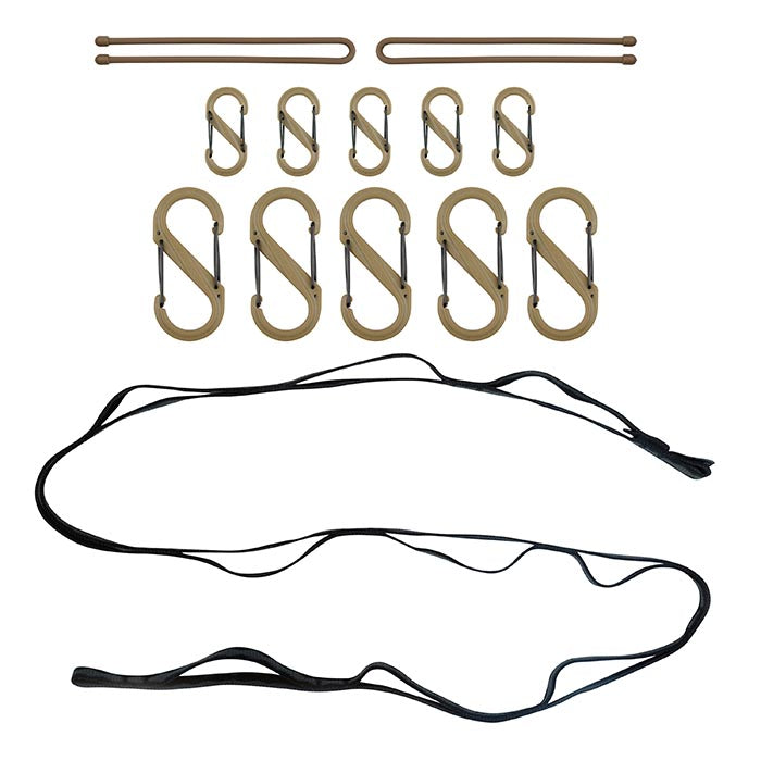 Made of high quality, wear-resistant webbing, the Gear Line Organization System features sturdy S-Biner double-gated carabiner clips in alternating sizes, each attached to its own individual sturdy loop, along with Gear Tie Reusable Twist Ties on each end. Just attach whatever tools, gear, gadgets, or clothing you want to each S-Biner and hang the Gear Line to any hook or knob - wherever it will be most convenient. Go vertical when you want to maximize storage and save wall space. Hang horizontally to keep things easily accessible at eye level or quickly dry out gear. Each S-Biner clips securely closed and unclips easily for fast, convenient attachment and detachment, and can easily be interchanged.