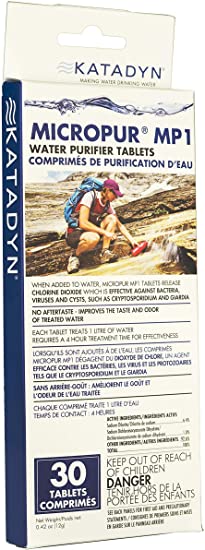 Micropur MP1 water purification tablets are only for emergency disinfection of drinking water. When used as directed, the tablets make contaminated water suitable for drinking.