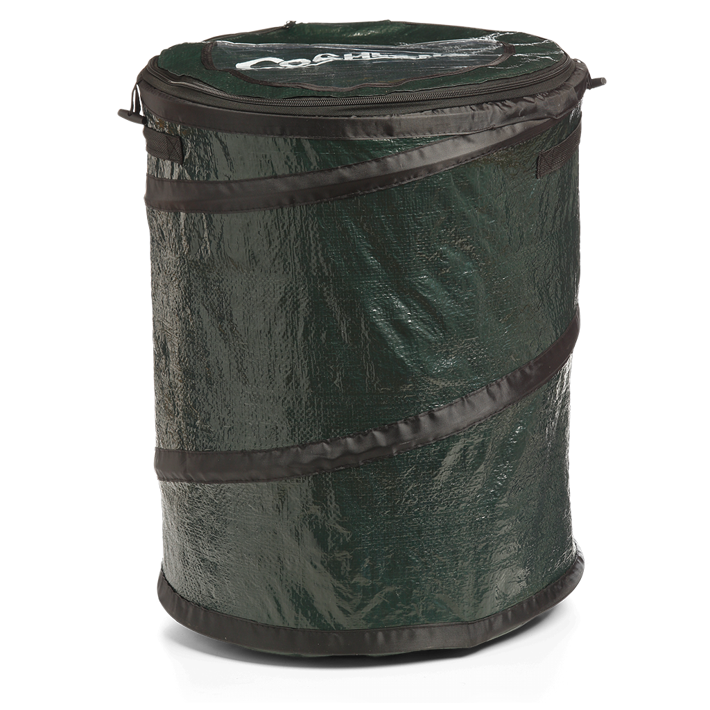 These lightweight containers are handy around the campsite, RV, or the home and are great for garbage, recycling, or storage. Spring loaded and simple to use, just unzip the storage lid and release the tabs and it automatically expands to its full size. When finished using, simply push it down flat, and secure the nylon tabs on the sides. Fully zippered top to deter pests and keep items in place.