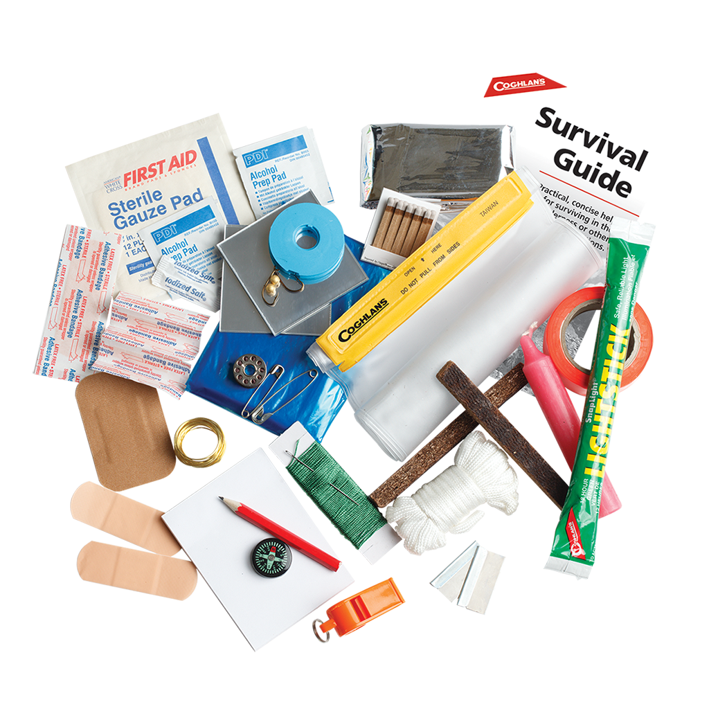 Contains*: emergency blanket, matches, signal whistle, 2 fire sticks, 12 Hr. lightstick, pencil, note pad, salt packet, 4 antiseptic pads, 4 - 1” x 3” bandages, 4 - 0.375” x 1 x 0.5” bandages, 2” x 3” elastic patch bandage, 3” x 3” sterile pad, 2 - 4” adhesive strips, compass, poncho, signal mirror, 50’ orange trail tape, 10’ snare wire, 2 razor blades, needle, spool of thread, 2 safety pins, 12’ nylon rope, 30’ fishing line, 2 fish hooks, 2 sinkers, 7” x 10” waterproof pouch, 35’ nylon cord, reusable 8” x 12” PVC pouch, 5 Hr. candle.