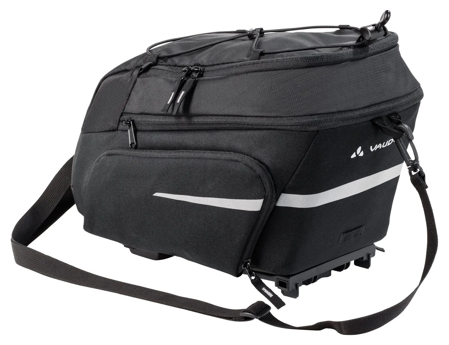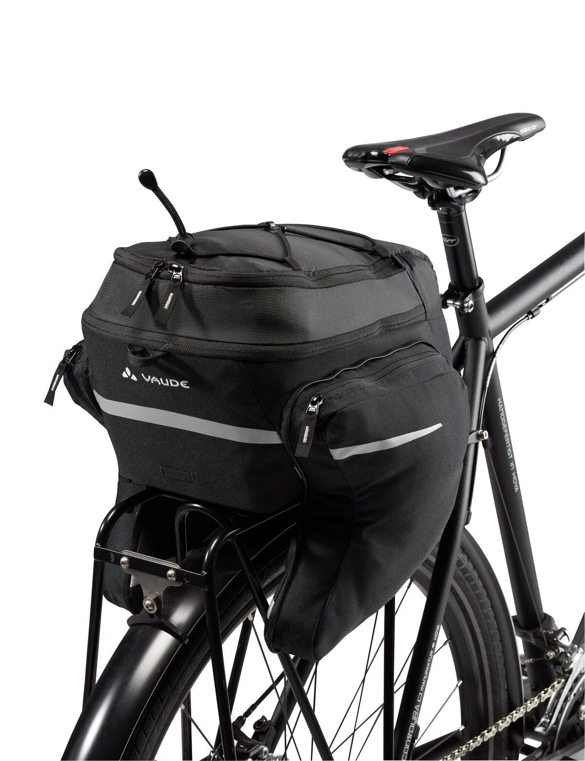 The versatile gear rack bag with a volume of 9 liters has two fold-out side pockets that provide 7 liters of additional storage space when required. In addition, the bike bag scores with a multitude of functional details – such as a cargo net for additional gear (like a jacket) as well as a zip pocket in the lid flap and reflective elements. Another plus is the detachable shoulder strap that turns the bag into a shoulder bag when you're done with your ride. The MIK attachment system allows the Silkroad Plus (MIK) bike bag to be attached quickly and securely to all bikes with MIK gear racks. This water resistant product is manufactured with environmentally friendly Eco Finish.